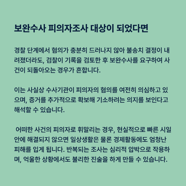 따라서 형사사건의 가해자가 되어 경찰조사 대상이 되었다면, 초기 단계부터 적극적으로 대응하는 것이 가장 현명합니다. 안일하게 대처하여 보완수사 명령이 내려진다면, 위 사례처럼 계속해서 경찰서와 검찰을 들락거리는 고통스러운 상황에 놓일 수 있습니다.