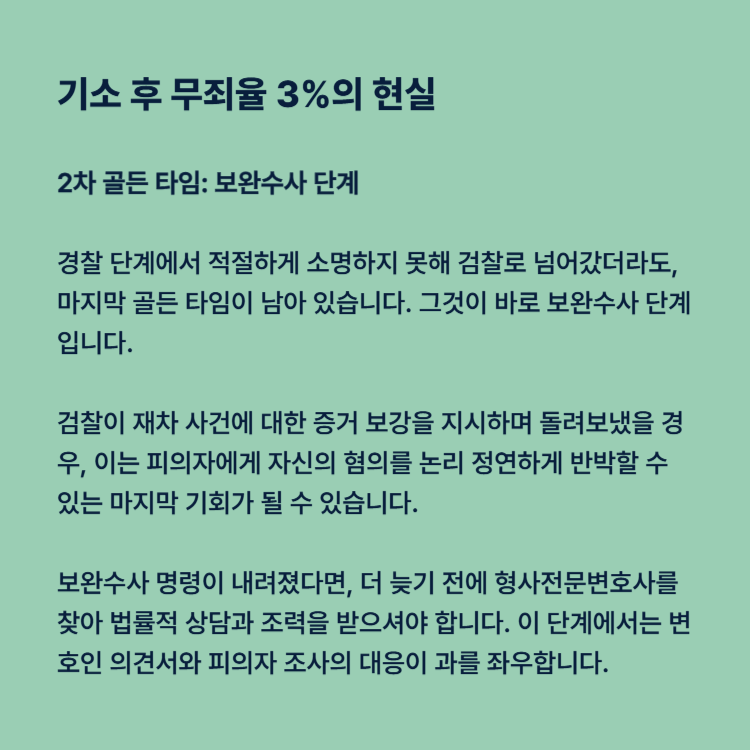 경찰 단계에서 적절하게 소명하지 못해 검찰로 넘어갔더라도, 마지막 골든 타임이 남아 있습니다. 그것이 바로 보완수사 단계입니다.