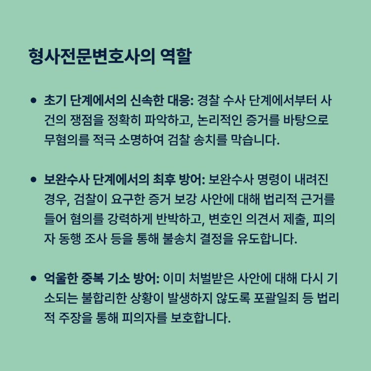 보완수사 단계는 사건을 가급적 불송치 결정으로 끝낼 수 있는 마지막 기회입니다. 더 이상 지체하지 마시고, 수많은 사건을 성공적으로 이끌어 온 형사전문변호사와 상담하여 여러분의 억울함을 해소하고 일상을 되찾으시기 바랍니다.