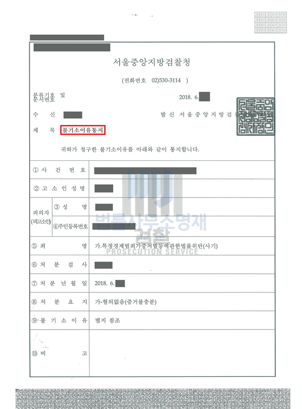 검찰은 의뢰인의 특정경제범죄 가중처벌 등에 관한 법률 위반(사기) 혐의에 대해 최종 무혐의처분을 하였습니다. 만일 혐의가 인정되었다면 3년 이상의 징역으로 처벌될 수 있었기 때문에 의뢰인은 큰 위기를 모면할 수 있었습니다.