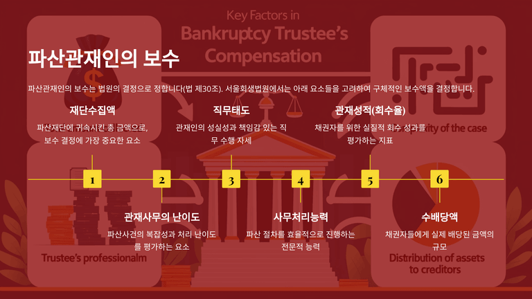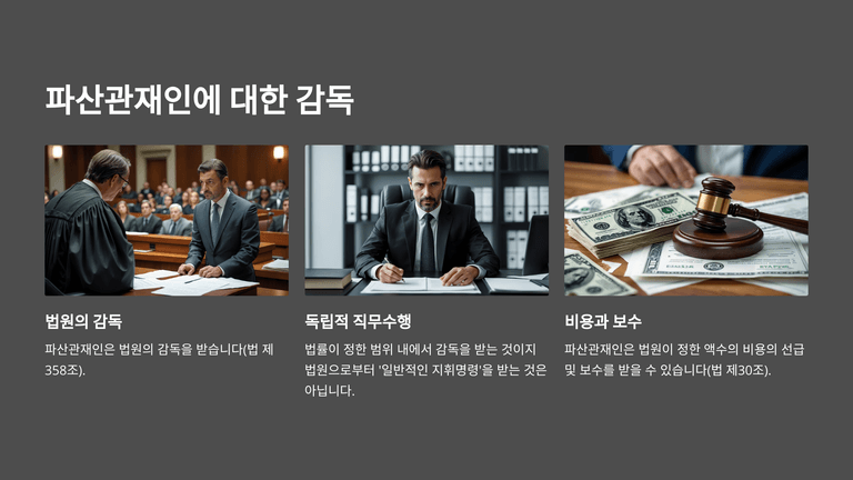 파산관재인은 법원의 감독을 받지만 일반적인 지휘·명령 관계에는 있지 않으며, 법원이 정한 절차 내에서 독립적으로 직무를 수행한다. 법원은 채권자집회의 결의, 감사위원의 신청 또는 직권으로 관재인을 해임할 수 있고, 보수는 재단수집액, 업무난이도, 회수율, 직무태도 등을 고려해 결정한다. 서울회생법원은 이러한 기준에 따라 구체적인 보수를 산정하고 있다.