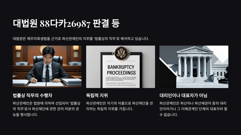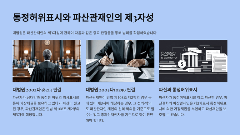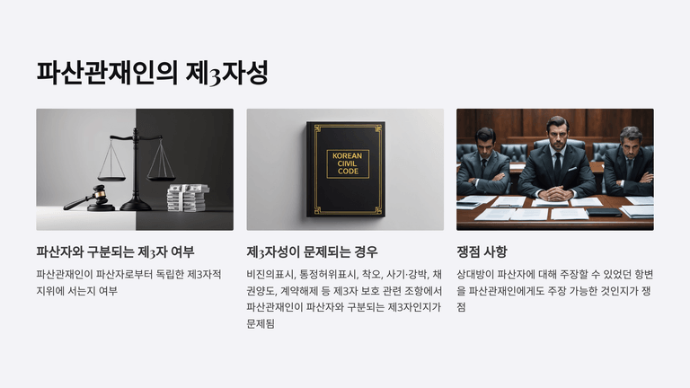 파산관재인의 법적 지위에 대해서는 파산자 대리설, 재단대표설, 법정신탁설 등 다양한 견해가 존재하나, 대법원은 관재인을 “법원에 의해 선임되어 자기 명의로 파산재단의 관리·처분권을 행사하는 독립된 법률상 기관”으로 본다(대법원 88다카26987). 또한 통정허위표시의 경우 파산관재인은 파산자로부터 독립한 제3자로 인정되며, 민법 제108조 제2항의 선의 여부는 파산관재인 개인이 아니라 전체 파산채권자를 기준으로 판단하여야 한다(대법원 2002다48214, 2004다10299).