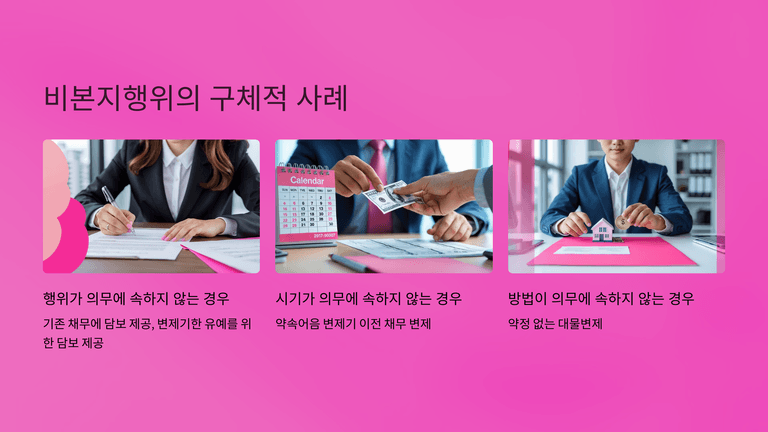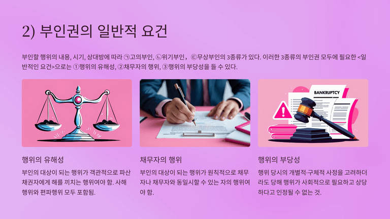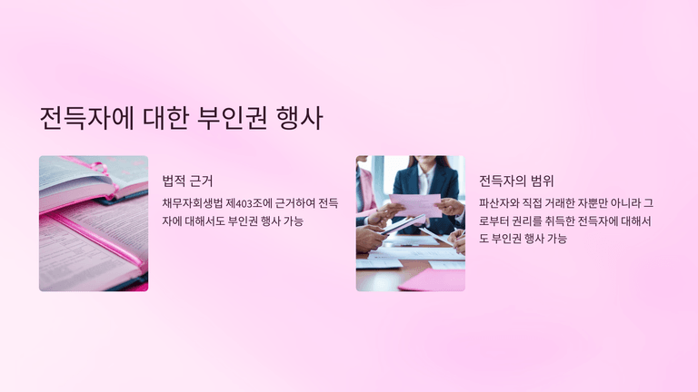 부인권은 고의부인, 위기부인, 무상부인의 세 가지 유형으로 나뉘며, 공통요건으로 행위의 유해성·채무자의 행위·행위의 부당성이 요구된다. 행위의 유해성이란 파산채권자에게 해를 끼치는 행위로, 사해행위나 편파변제가 이에 포함된다. 변제기 도래 여부와 무관하게 특정 채권자만을 유리하게 한 변제나 기존채무에 대한 담보권 설정은 부인의 대상이 될 수 있다. 다만 영업 지속이나 임금 지급 등 사회적 상당성이 인정되는 경우에는 예외로 본다.