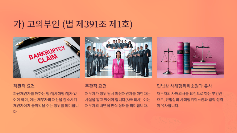 고의부인(법 제391조 제1호)은 채무자가 파산채권자를 해함을 알고 행한 사해행위에 대해 행사된다. 위기부인(제2·3호)은 지급정지나 파산신청 등의 위기상태 이후 행한 행위를 대상으로 하며, 채무자의 사해의사는 필요하지 않다. 본지행위에 대한 위기부인은 지급정지 이후의 변제 등을, 비본지행위에 대한 위기부인은 지급정지 전 60일 이내에 행한 의무 외 행위를 부인한다. 무상부인(제4호)은 파산신청 전 6개월 내의 무상행위에 대해 상대방의 인식과 무관하게 행사된다.