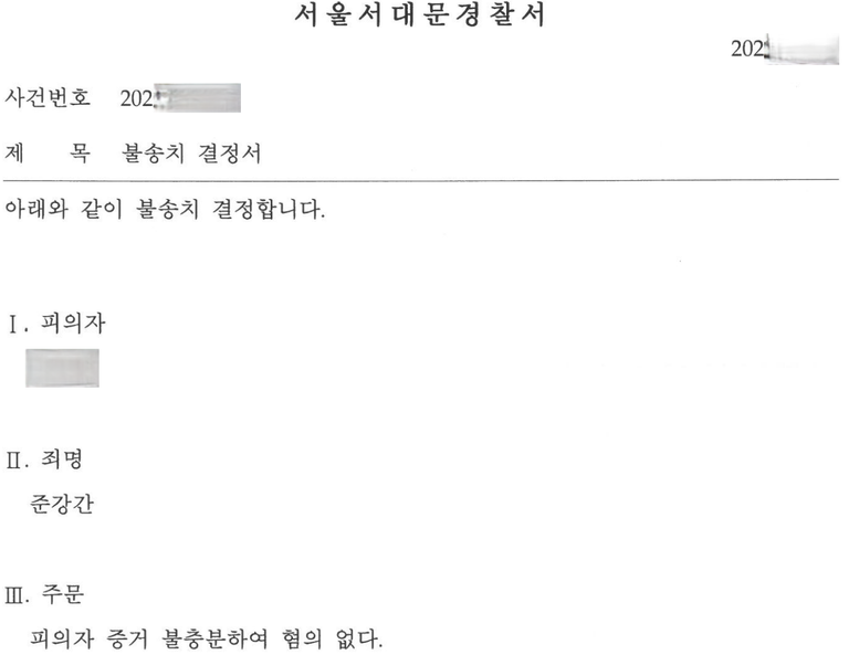결국 의뢰인에게는 불송치결정(혐의없음) 이 내려졌고, 준강간 고소 사건은 무혐의로 종결되었습니다.