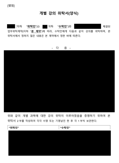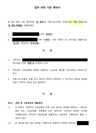 이에 따라 아래와 같은 주요 사항을 중심으로 계약서를 설계하여 강사가 근로자가 아닌 프리랜서에 해당할 수 있도록 명확히 하였습니다.
