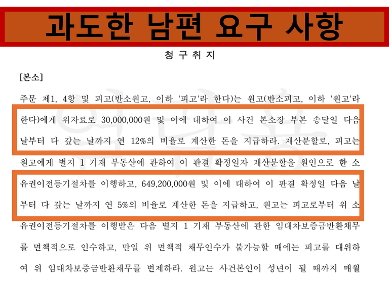 이런 구조에서 남편은 신혼집 마련 당시 본인 부모가 금전적으로 더 많이 도왔다며, 재산분할에서 자신의 지분을 더 크게 인정해야 한다고 주장했을 뿐 아니라 아내에게 추가 금액까지 지급하라고 요구하며 협의는 결렬되었습니다.