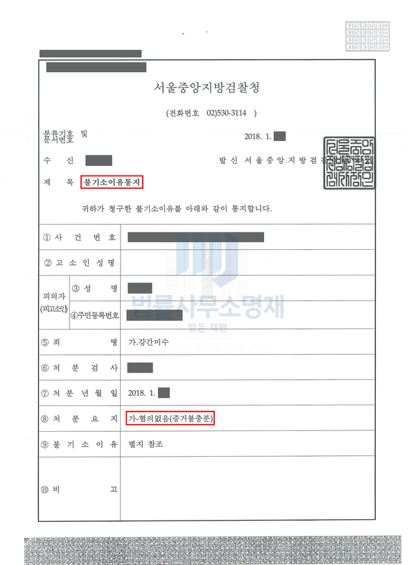 검찰은 의뢰인의 강간미수 혐의에 대해 최종 무혐의처분(증거불충분)을 하였습니다. 덕분에 의뢰인은 동호회 모임을 통해 이성과의 연애를 시작하려다 강간미수범이 되어 자칫 성범죄 전과가 생길 수 있었던 위기를 모면할 수 있었습니다.