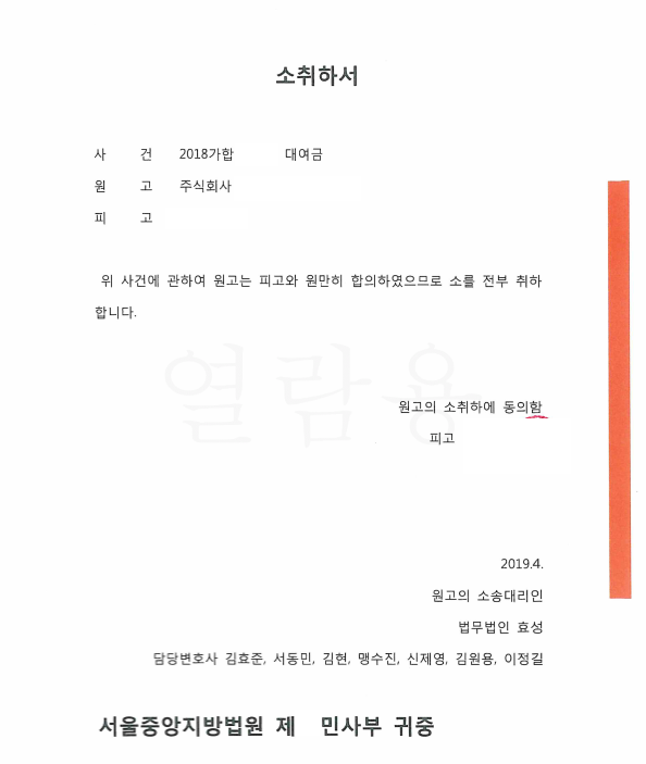 저는 즉각 피고를 상대로 민사소송 대여금청구를 하였고 소송 과정에서 피고가 청구액을 지급하고 합의한 후 소를 취하하였습니다.
