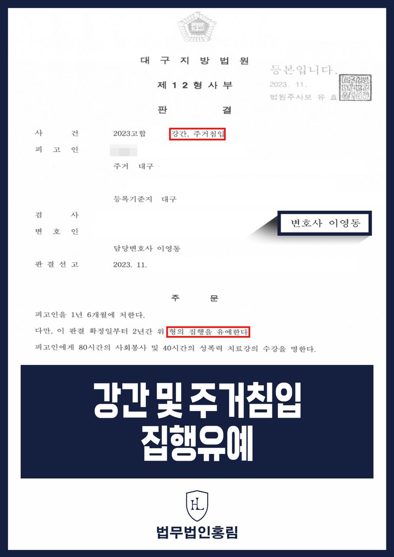 결과적으로 재판부는 의뢰인에게 징역형을 선고하되 실형 선고를 막고 집행유예를 선고하는 관대한 판결을 내렸습니다.