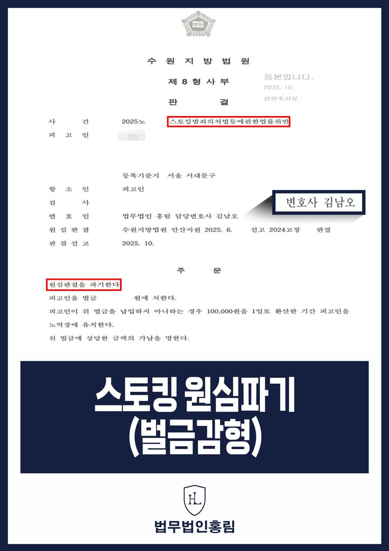 이는 스토킹범죄 혐의에 대해 유죄는 인정되었으나, 항소를 통해 원심파기 및 벌금 감형이라는 성공적인 결과를 이끌어내어 피고인의 직업적 불이익을 최소화하고 명예를 부분적으로 회복한 중요한 사례로 평가됩니다.