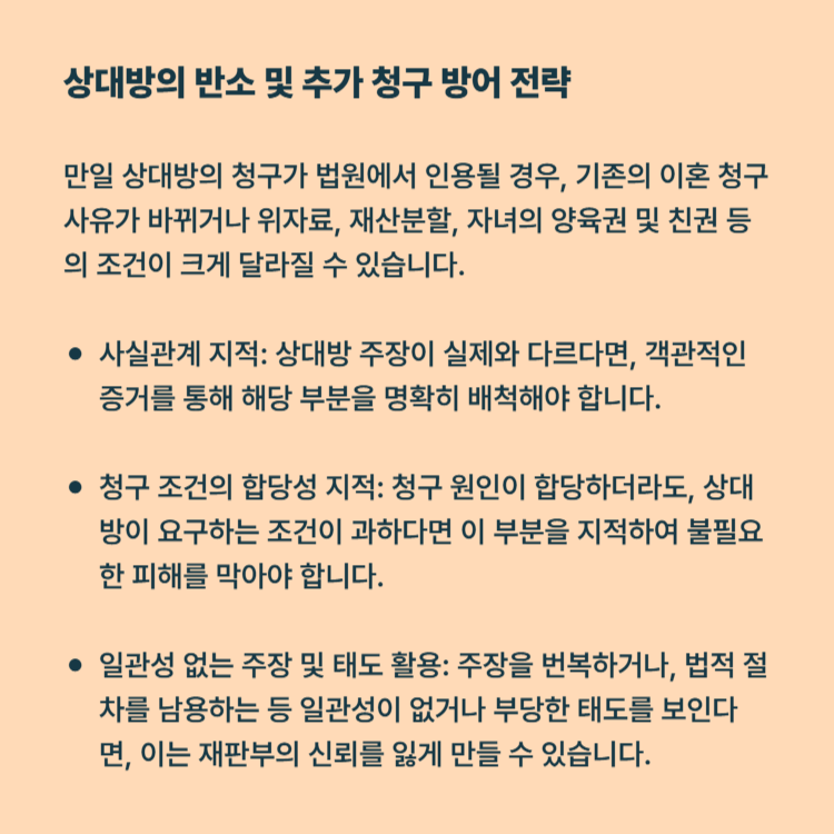 만일 상대방의 청구가 법원에서 인용될 경우, 기존의 이혼 청구 사유가 바뀌거나 위자료, 재산분할, 자녀의 양육권 및 친권 등의 조건이 크게 달라질 수 있습니다. 따라서 상대방의 청구가 받아들여지지 않도록 철저히 방어해야 합니다.