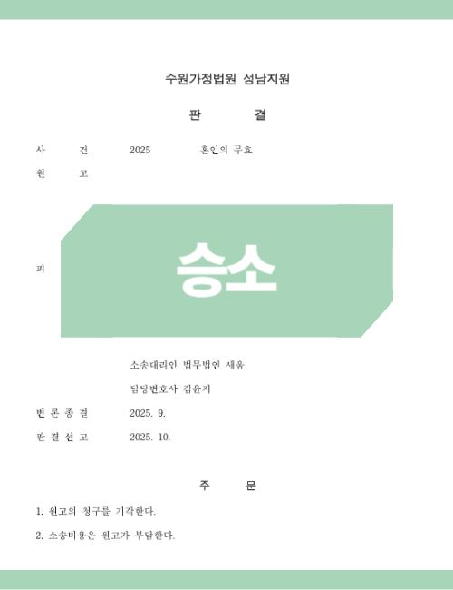새움의 치밀한 법리 분석과 B씨의 부당한 태도에 대한 전략적 지적을 통해 B씨의 혼인무효 청구 기각을 이끌어냈습니다. 나아가, 소송비용 또한 B씨가 전부 부담하는 결과를 얻어 의뢰인의 피해를 최소화할 수 있었습니다.