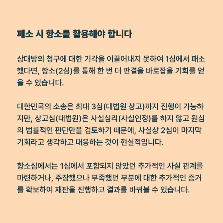 대한민국의 소송은 최대 3심(대법원 상고)까지 진행이 가능하지만, 상고심(대법원)은 사실심리(사실인정)를 하지 않고 원심의 법률적인 판단만을 검토하기 때문에, 사실상 2심이 마지막 기회라고 생각하고 대응하는 것이 현실적입니다.