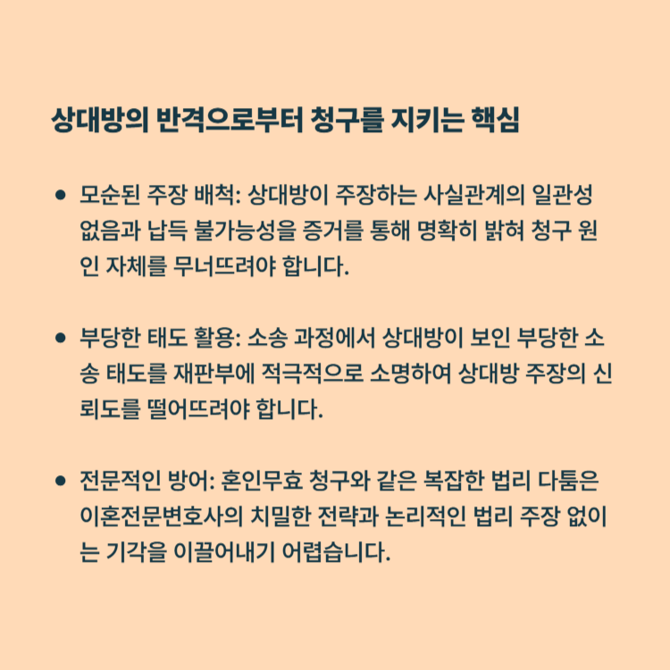 이혼 청구 소송에서 상대방이 반소나 혼인 취소, 혼인무효 등 추가적인 법적 대응을 해올 경우, 소송이 복잡해지고 불리하게 전개될 위험이 커집니다.