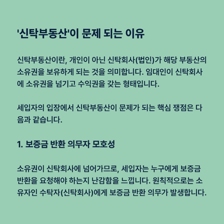 세입자의 입장에서 신탁부동산이 문제가 되는 핵심 쟁점은 다음과 같습니다.
