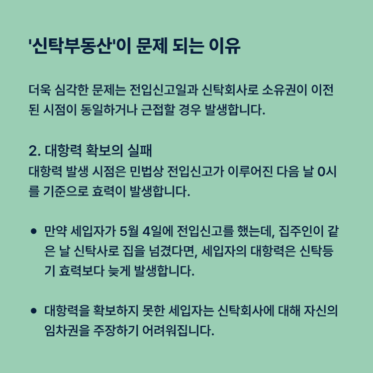 결과: 대항력(세입자로서 권리를 주장할 권리)을 확보하지 못한 세입자는 신탁회사에 대해 자신의 임차권을 주장하기 어려워집니다.