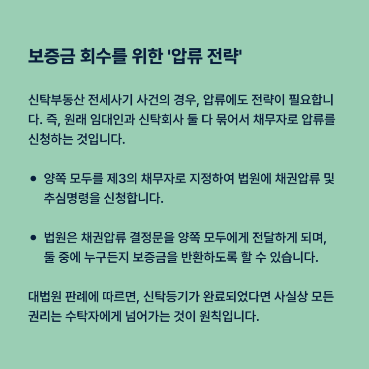 이처럼 복잡하게 얽힌 신탁부동산 전세사기 사건의 경우, 압류에도 전략이 필요합니다. 즉, 원래 임대인(위탁자)과 신탁회사(수탁자) 둘 다 묶어서 채무자로 압류를 신청하는 것입니다.