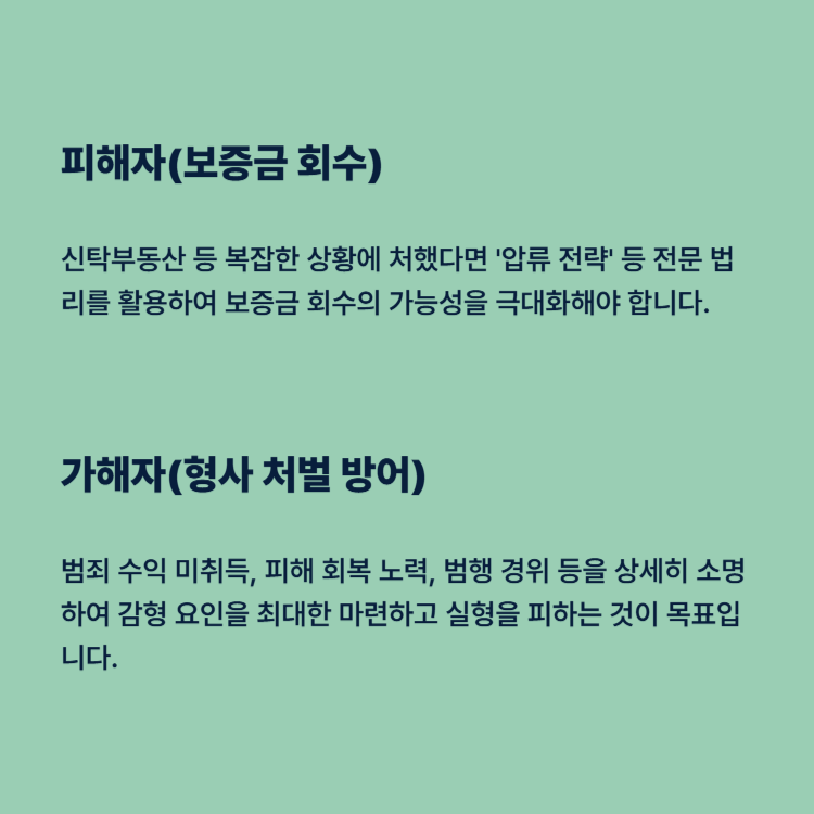 위 두 개의 사례처럼, 피해자는 민사절차를 통해 보증금을 회수하고 추가적인 손해배상을 이끌어내야 하며, 가해자는 실형을 피하기 위한 강력한 감형 요인을 마련해야 합니다.