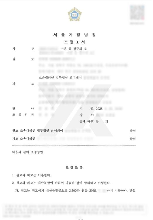 법무법인 YK 이혼 변호사의 조력으로, 의뢰인과 의뢰인의 남편은 결국 조정을 통하여 이혼하는 데에 합의하였습니다.