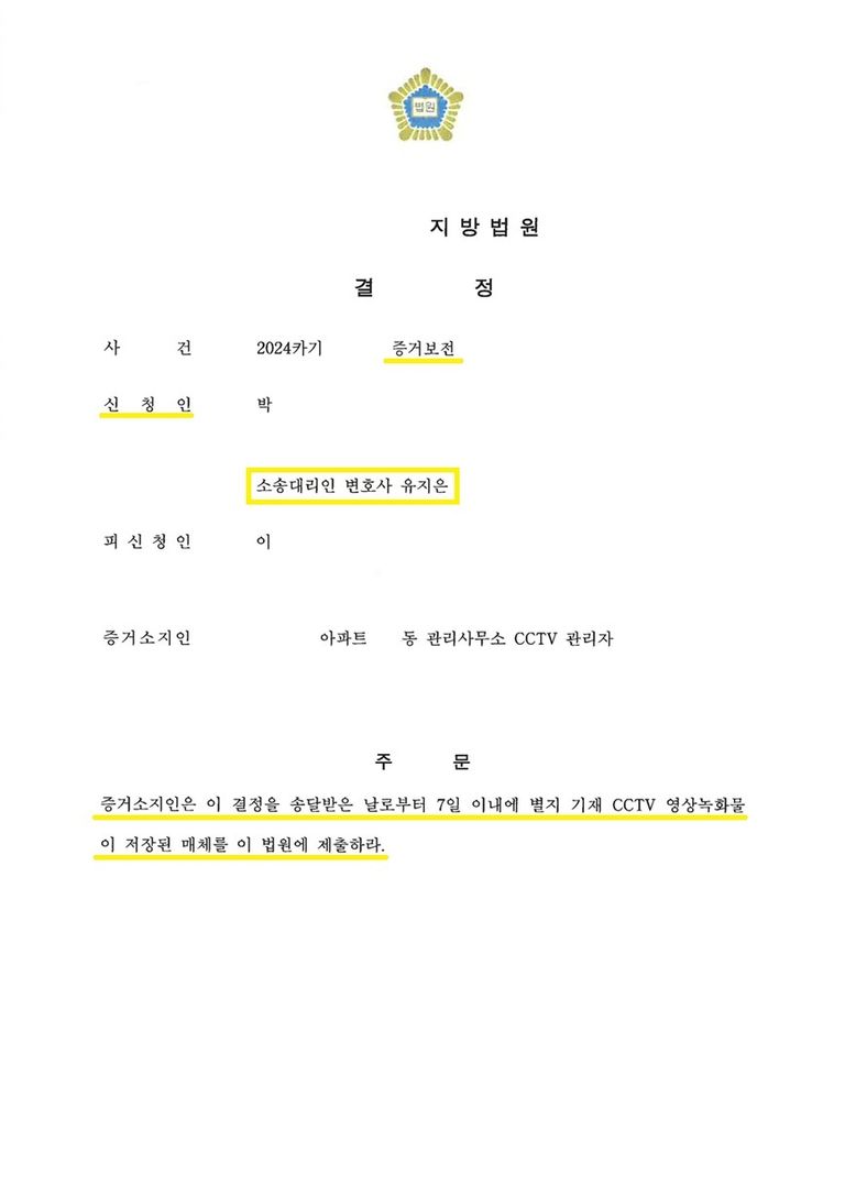 아내의 휴대폰에서 상간남의 이름과 연락처는 확인하였으나 외도 증거가 전혀 없었기 때문에 저희는 증거부터 확보해야 했습니다. 구글 타임라인에 아내가 자주 방문한 아파트가 있었지만 정확한 동호수가 확인되지 않았고, 아내가 차량 블랙박스와 네비 검색기록 또한 삭제한 상황이었습니다. 다행히 네비 검색기록을 복구하여 아내가 방문한 아파트 동을 확인할 수 있었고, 관리사무소에 아내가 상간남 집에 방문한 것으로 추정되는 날짜와 시간을 특정하여 아파트 출입구, 현관 및 엘리베이터 앞과 내부 CCTV 녹화영상에 관하여 증거보전 신청을 하였습니다.