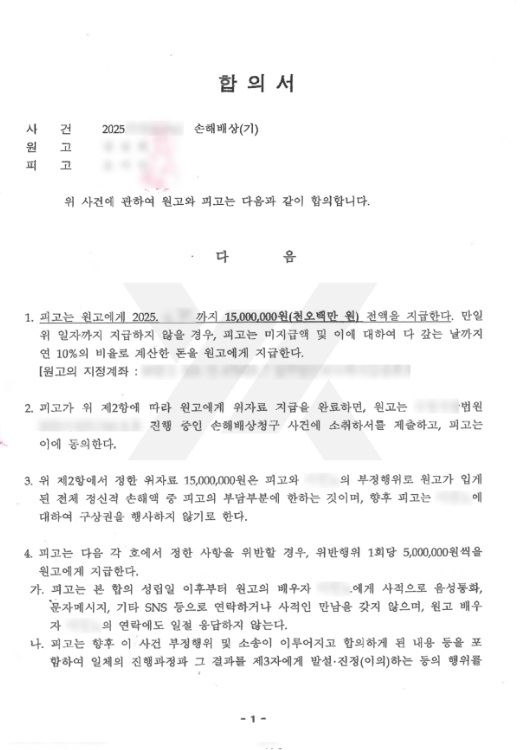 최초 내용증명에서는 간략히 다수의 부정행위 증거들을 확보하고 있다고만 하고, 상대방이 합의 의사 없음을 확인한 뒤 소장에서 다수의 증거를 제출했습니다. 소장이 송달되기 전까지만 하더라도 부정행위가 아니라는 식의 태도를 보이던 상대방이 송달되자 합의하고 싶다며 연락을 취해 왔고, 합의금을 당초 3,000만 원에서 1,500만 원으로 감액하는 대신 의뢰인 아버지에 대한 구상권 포기 조항과 위반행위(연락, 만남, 제3자 발설 금지 등) 1회당 500만 원의 위약벌 조항을 추가하였습니다.