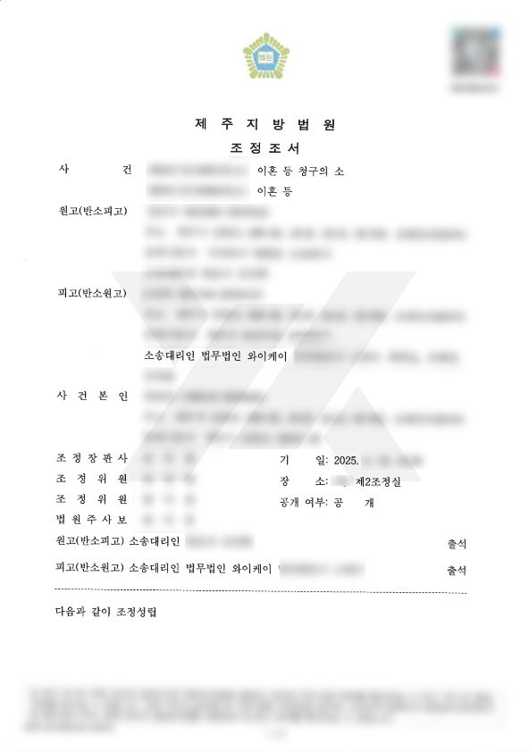 법무법인 YK의 조력으로 조정이 성립됐고, 의뢰인이 자녀에 대한 친권자 및 양육권자로 지정되었습니다.