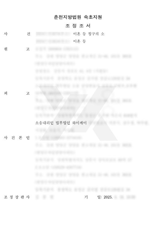 법무법인 YK 이혼 변호사의 조력으로 조정기일에서 이혼, 사건본인들의 친권자 및 양육자를 피고로 지정하고, 양육비 및 재산분할로 피고가 사건본인들과 거주하고 있는 아파트의 소유권이전등기절차를 이행하며, 소송비용은 각자 부담하는 것으로 조정이 성립되어 종결되었습니다.