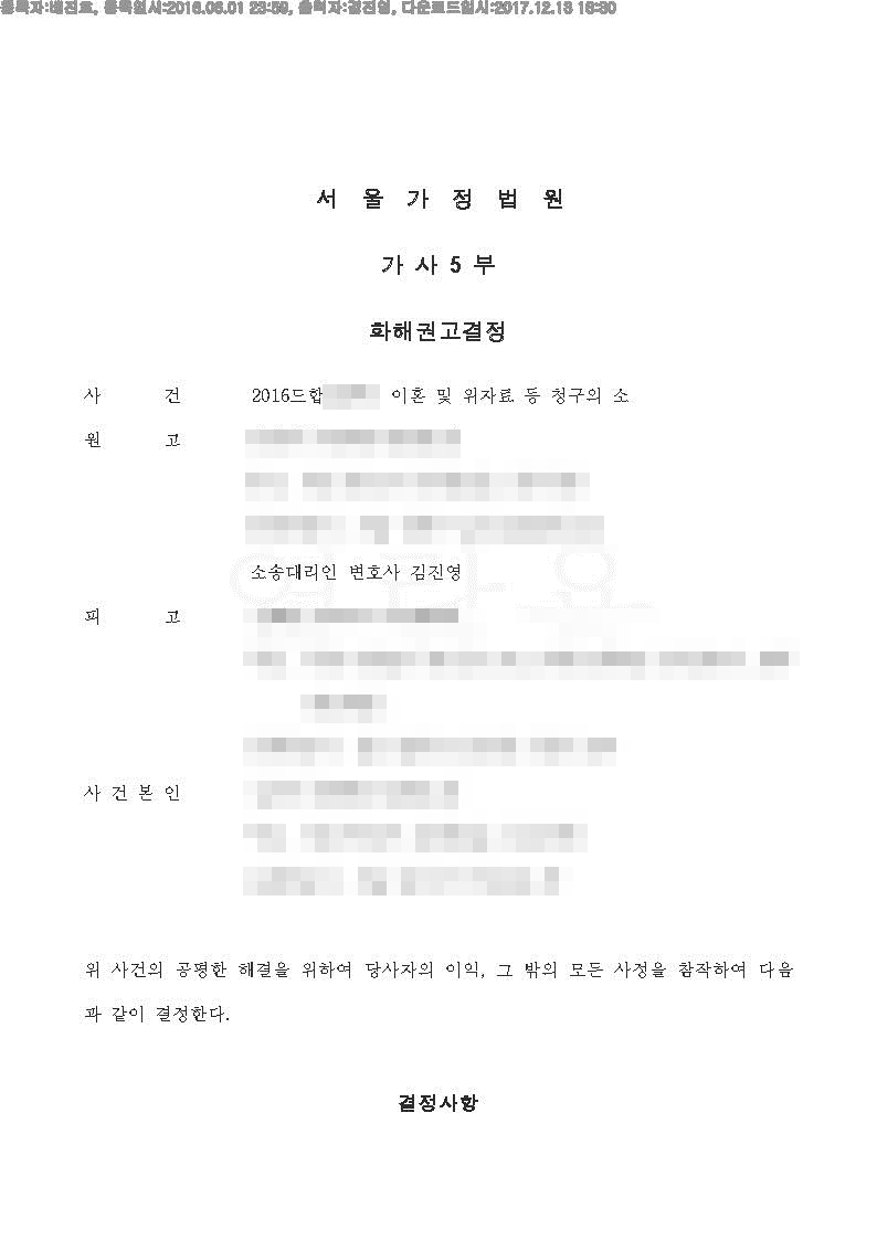 결과 : 저희 법률사무소에서 소송을 진행하였으며 법원에서 조정에 회부하였으며, 저희 대표변호사인 김진영변호사님께서 조정을 잘 이끌어 내어 50%의 재산 분할금과 양육권 그리고 월 150만원의 양육비를 지급받을 수 있었습니다.