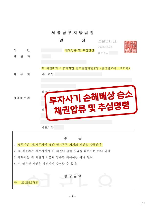 ![[💵채권압류] 투자사기 불법행위 손해배상 채권압류 및 추심명령](/_next/image?url=https%3A%2F%2Fd2ai3ajp99ywjy.cloudfront.net%2Fuploads%2Ftitleimage%2Foriginal%2F5c233429c2f7a4a918c08df0-original.jpg&w=3840&q=75)