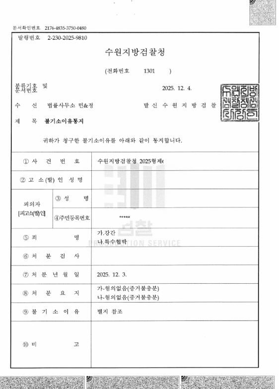 법리적으로도, 사실관계 상으로도 강간이 성립하지 않는다는 점을 강하게 피력했습니다. 그 결과 담당 검사는 해당 사건을 전부 무혐의 불기소처리하였습니다.