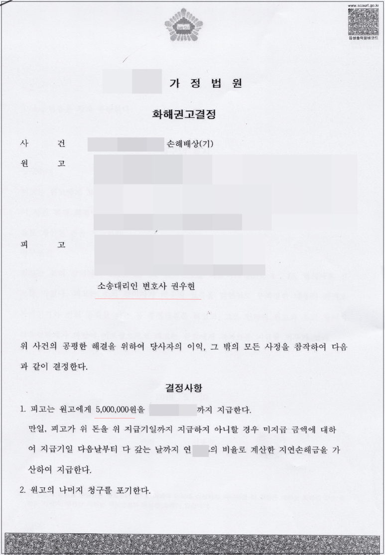 * 아래 사례는 원고의 처와 #부정행위를 하였다는 이유로 3,000만원의 위자료 지급 청구소송을 당하였다가 본인이 피고 대리인으로 소송을 수행하여 소액 500만원으로 화해권고결정(확정)이 떨어진 사례(확정)인데, 상간자 입장에서 금전적으로 성공적인 방어를 하였지만 다른 한 편 원고의 처는 앞으로 같이 살기를 정말 원치 않는 원고와 어떻게 이혼할지 궁금합니다.