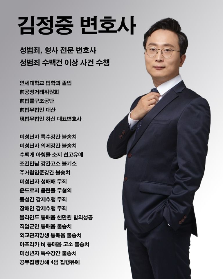 안녕하세요. 성범죄, 형사 전문 김정중 변호사입니다.