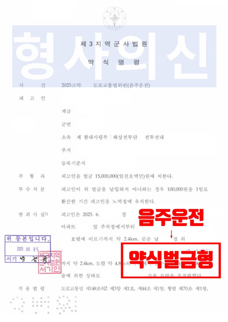 해군검찰단 군검사는 법률사무소 유(唯)의 형사전문변호사가 제출한 변호인의견서의 내용을 받아들여 의뢰인을 약식기소하였고, 제3지역 군사법원 약식계는 의뢰인에게 벌금 1500만 원을 가납할 것을 명하였습니다.