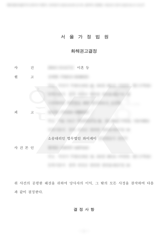 법무법인 YK의 조력으로, 상대방과 합의한 결과 화해권고결정이 내려졌고, 이혼 소송은 별도의 정식 판결 없이 종결되었습니다.