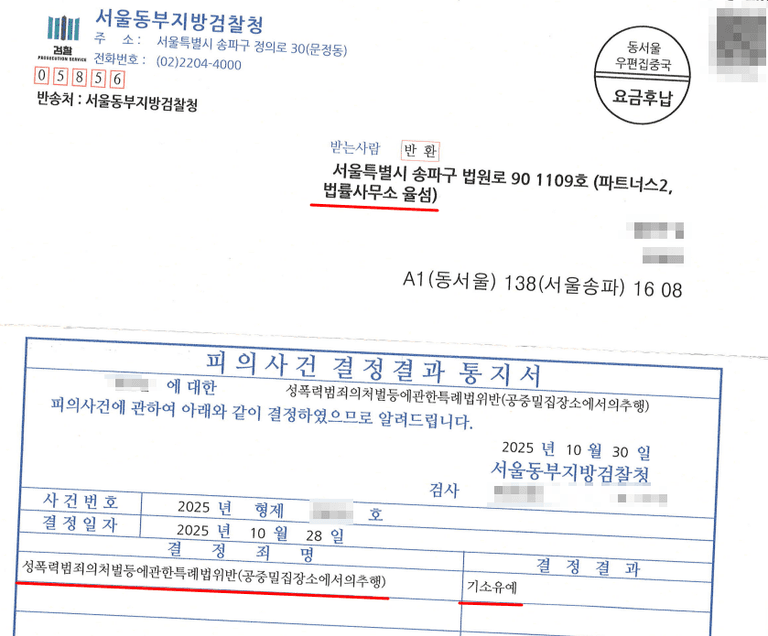 의뢰인은 본인의 혐의를 전부 인정하는 상황에서 의뢰인을 대신하여 피해자와 합의 절차를 진행하였고, 기타 의뢰인에게 유리한 양형자료를 바탕으로 한 변호인의견서 제출 등을 통하여 기소유예 결정을 받았습니다.