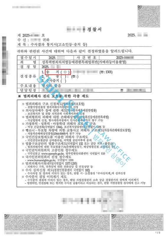 - 의뢰인의 명확하고 일관된 진술과 심앤이가 제출한 변호사 의견서를 종합한 결과, 담당 수사관은 포렌식으로 불법 촬영물이 발견되지는 않았지만 가해자의 카메라이용촬영 혐의가 인정된다고 판단하여 송치 결정을 내렸습니다.