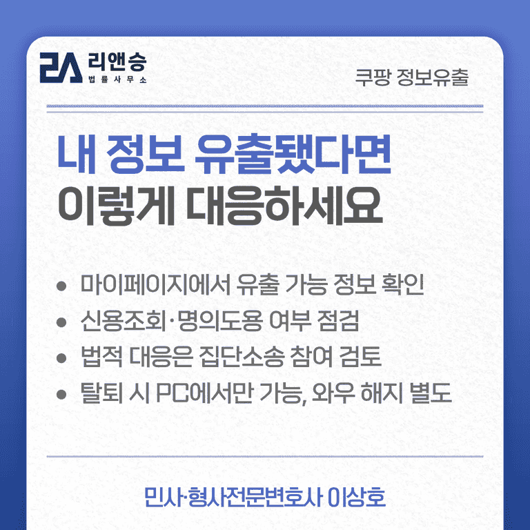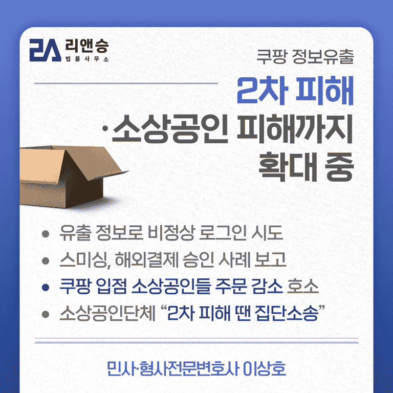 정보가 유출되면 이후 스미싱·해외 결제 승인·비정상 로그인 등 연쇄 피해 발생 가능성이 높고, 이는 쿠팡의 손해배상책임 범위를 넓힐 수 있는 요소가 됩니다.
