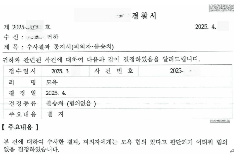 조사 당일 의뢰인은 사전에 준비한 진술 전략에 따라 일관되고 구체적인 진술을 제시하였고, 저희는 모욕죄 구성요건에 관한 법리적 의견서와 근거자료 일체를 보충 제출하였습니다.