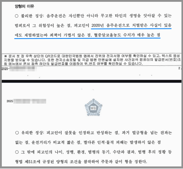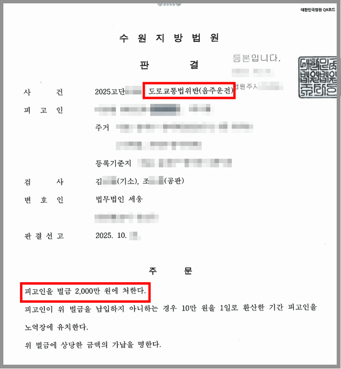 법원에서는 단기간의 재범이고 수치가 매우 높다는 점을 지적하면서도 변호인의 변론 내용을 적극 참작하여 의뢰인에게 벌금형의 선처를 하였습니다.