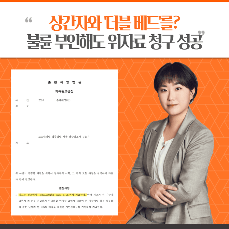 상대방이 모든 부정행위 사실을 부인하는 어려운 상황에서도, 저희는 핵심적인 증거와 주장을 통해 의뢰인께 만족스러운 결과(일부 인용 화해권고결정)를 안겨드릴 수 있었습니다.