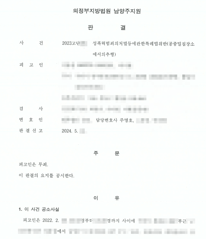늦은 밤 시내버스에서 발생한 성추행 의혹으로 기소된 사건에서, 법원은 피해자 진술만으로는 혐의를 인정하기 어렵다고 보아 무죄를 선고했습니다. 이 사건은 ‘공중밀집장소에서의추행’ 혐의 판단 기준을 다시 한 번 확인한 판결이었습니다.