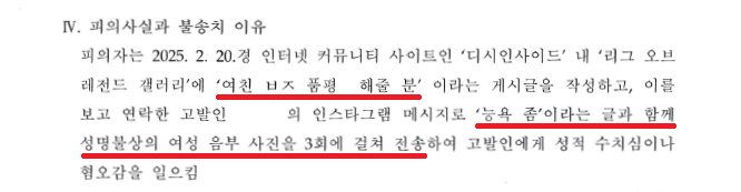 장교 A씨는 2025. 2. 20.경 인터넷 커뮤니티 사이트 '디씨인사이드'에서 '여친 ㅂㅈ 품평해 줄 분'이라는 제목으로 인스타그램 아이디를 기재한 게시글을 작성하였습니다. 그러자 얼마 지나지 않아 B씨가 인스타그램 DM으로 인사하였고, A씨는 게시글을 보고 인사하는 사람으로 여기고 B씨에게 "능욕 좀"이라는 채팅과 함께 총 3회에 걸쳐 여성의 성기 사진을 전송하였습니다.