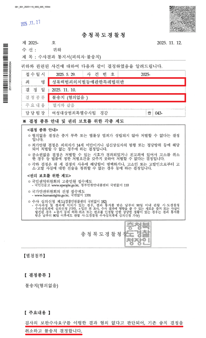 얼마 뒤, 검사는 보완수사요구를 하였고, 경찰은 추가조사가 필요하다며 출석요구를 하였습니다. 이에 저는,