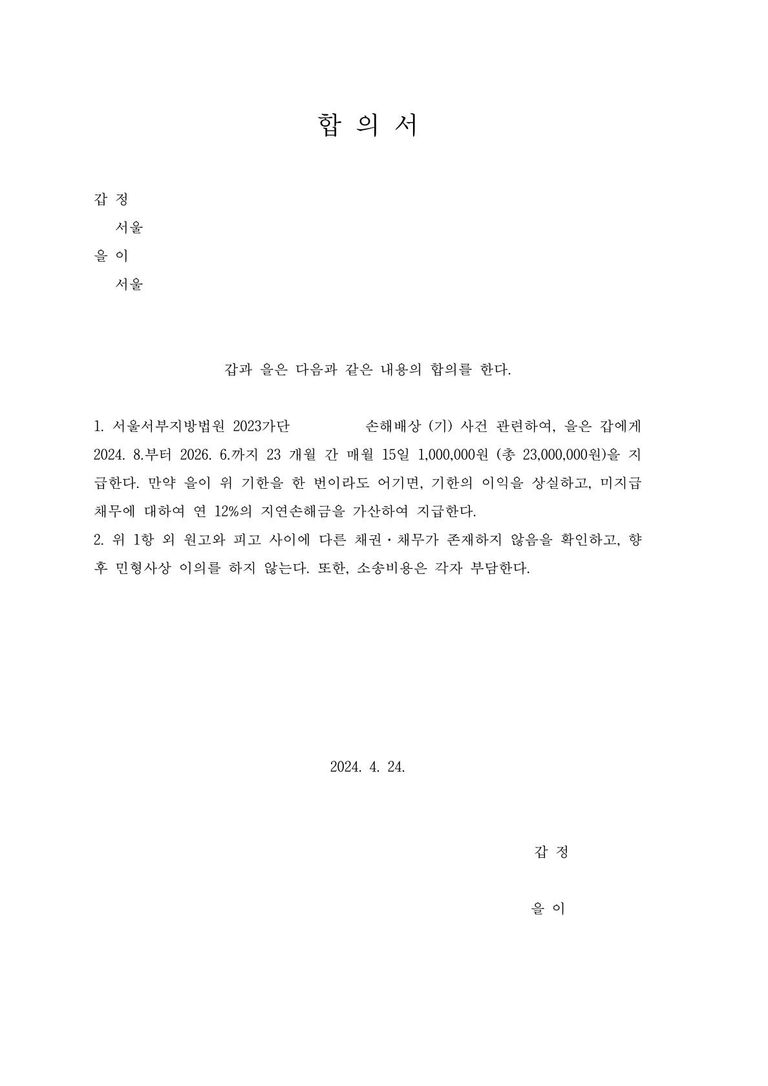이후 피고는 저에게 연락하여 분납을 하는 조건으로 합의를 하여 달라고 부탁을 하였고, 최종적으로 피고와 매월 100만원씩 23개월 동안 정기적으로 이체를 하는 조건으로 합의를 하게 되었습니다. (합계금액 2300만원)