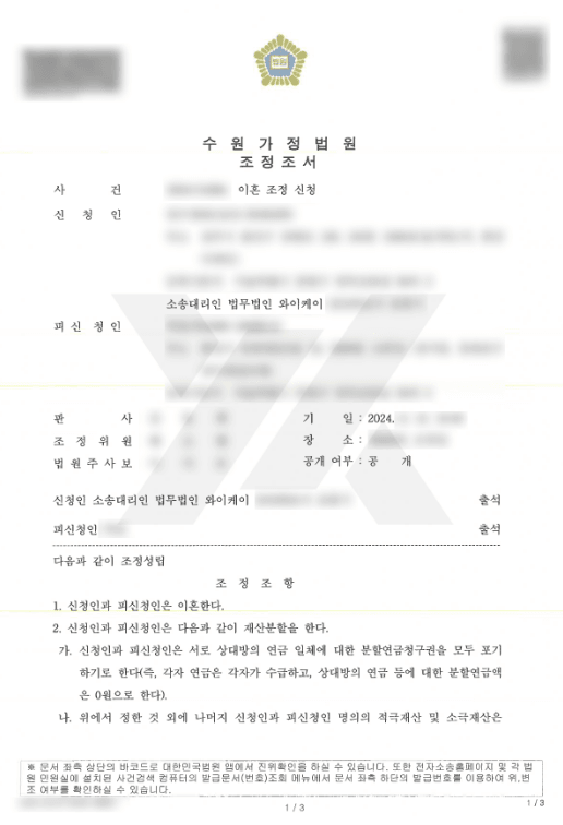 법무법인 YK 이혼 변호사의 조력으로, 조정기일에서 상대방의 동의를 이끌어내 조정이 성립되었으며,