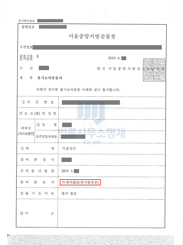 검찰은 저의 변론을 받아들여 의뢰인에 대한 준강간 혐의에 대해 불기소처분을 하였습니다. 덕분에 의뢰인은 하룻밤 잠자리로 인해 억울하게 성범죄자가 될 수 있는 위기에서 벗어날 수 있었습니다.