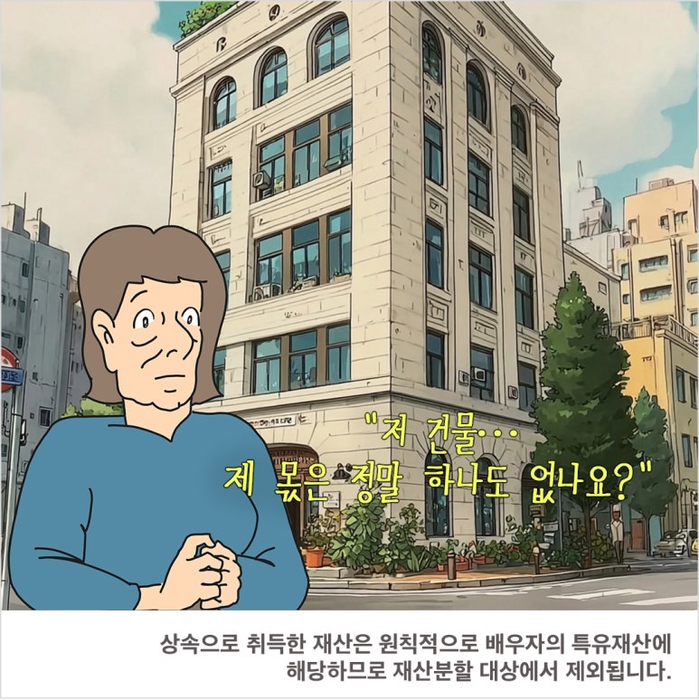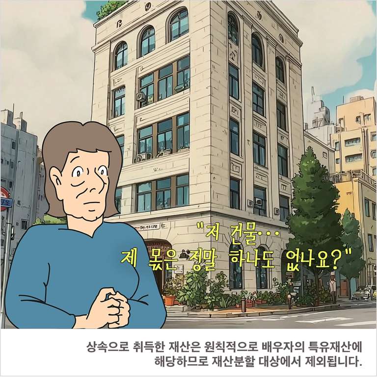 상속건물 자체는 원칙적으로 재산분할 목록에 포함되기 어렵습니다. 그러나 이는 곧바로 아내의 기여가 완전히 무시된다는 의미가 아닙니다.