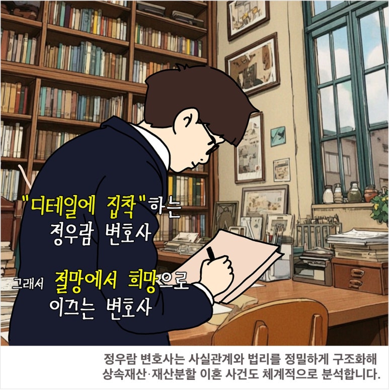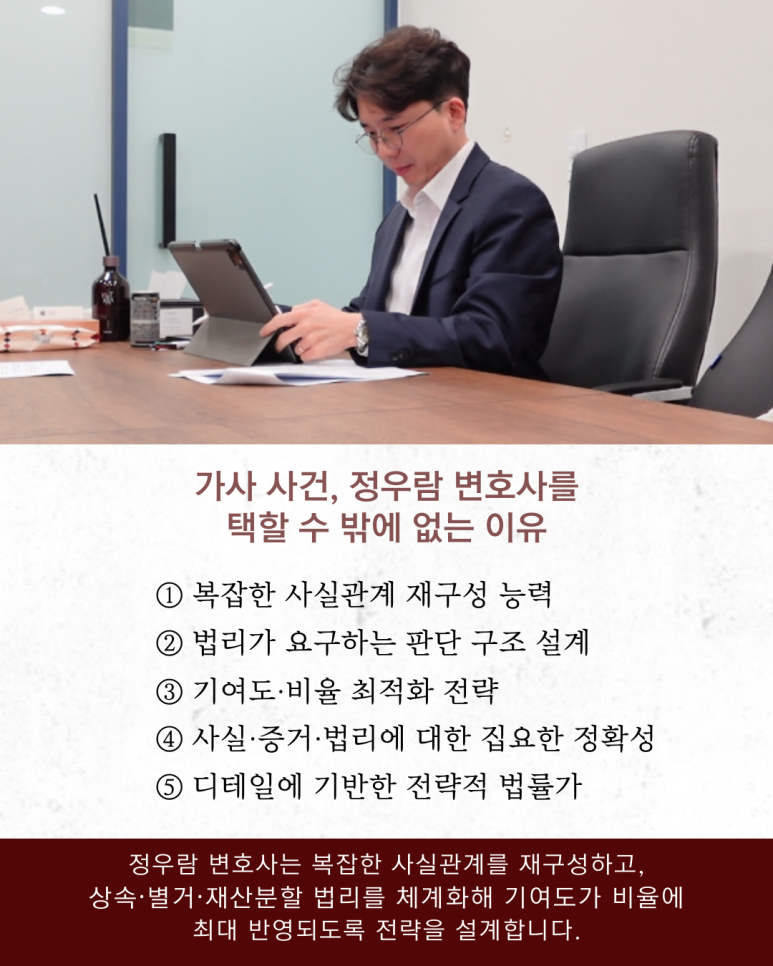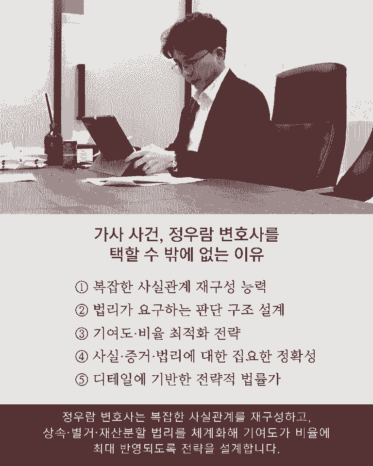 정우람 변호사는 이러한 문제를 '상속재산 여부'의 문제가 아니라 혼인 파탄 경위와 가정 유지 기여 구조 전반을 재구성해야 하는 문제로 보고,