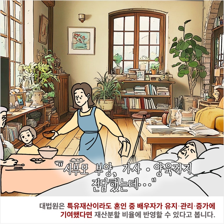 상속 재산이 특유 재산에 해당한다고 하더라도, 아내가 상속 건물의 유지·관리, 시부모 부양, 가사·양육 부담을 장기간 전담해 왔다면 그 기여는 재산분할 비율 조정의 중요한 판단 요소가 됩니다.